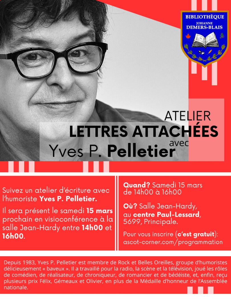 L’humoriste Yves P. Pelletier viendra régaler les aspirants auteurs et autrices en visioconférence. Nous vous recevrons à la salle Jean-Hardy du centre Paul-Lessard entre 14h00 et 16h00!