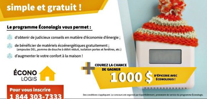 Bonjour, Le programme ECONOLOGIS, du ministère de l’Environnement, de la Lutte contre les changements climatiques, de la Faune et des Parcs du gouvernement du Québec, est de retour cette année. Ce programme donne l’opportunité aux citoyens de profiter gratuitement de conseils et d’interventions visant à améliorer l’efficacité énergétique de leur logement. Les interventions proposées sont […]