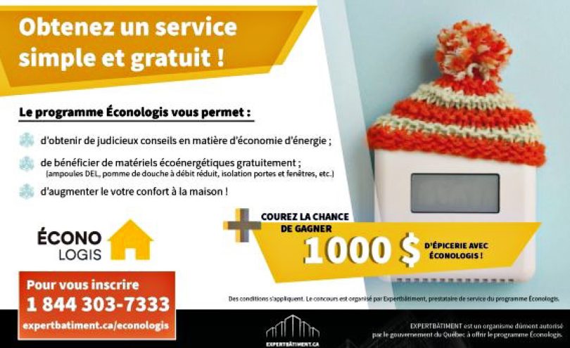 Le programme ECONOLOGIS, du ministère de l’Environnement, de la Lutte contre les changements climatiques, de la Faune et des Parcs du gouvernement du Québec, est de retour cette année. Ce programme donne l’opportunité aux citoyens de profiter gratuitement de conseils et d’interventions visant à améliorer l’efficacité énergétique de leur logement.