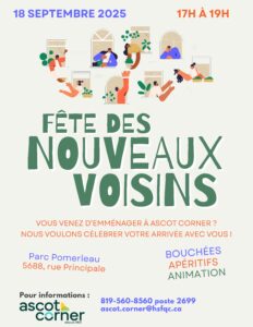 La Municipalité d’Ascot Corner organise un 5 à 7 le 18 septembre 2025 au parc Pomerleau afin de fêter l’arrivée sur son territoire de ses nouveaux résidents et résidentes.